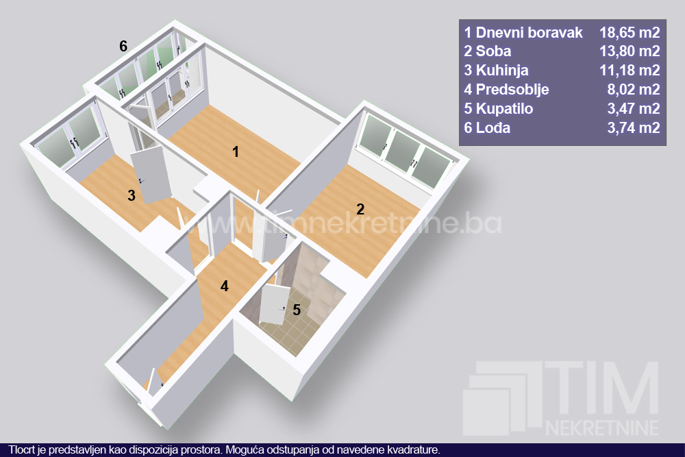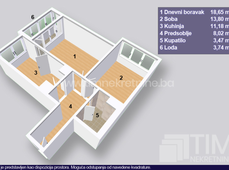 Stan je dvostrane orijentacije (istok-jug) te je veoma svijetao i prozračan sa funkcionalnim rasporedom prostorija.